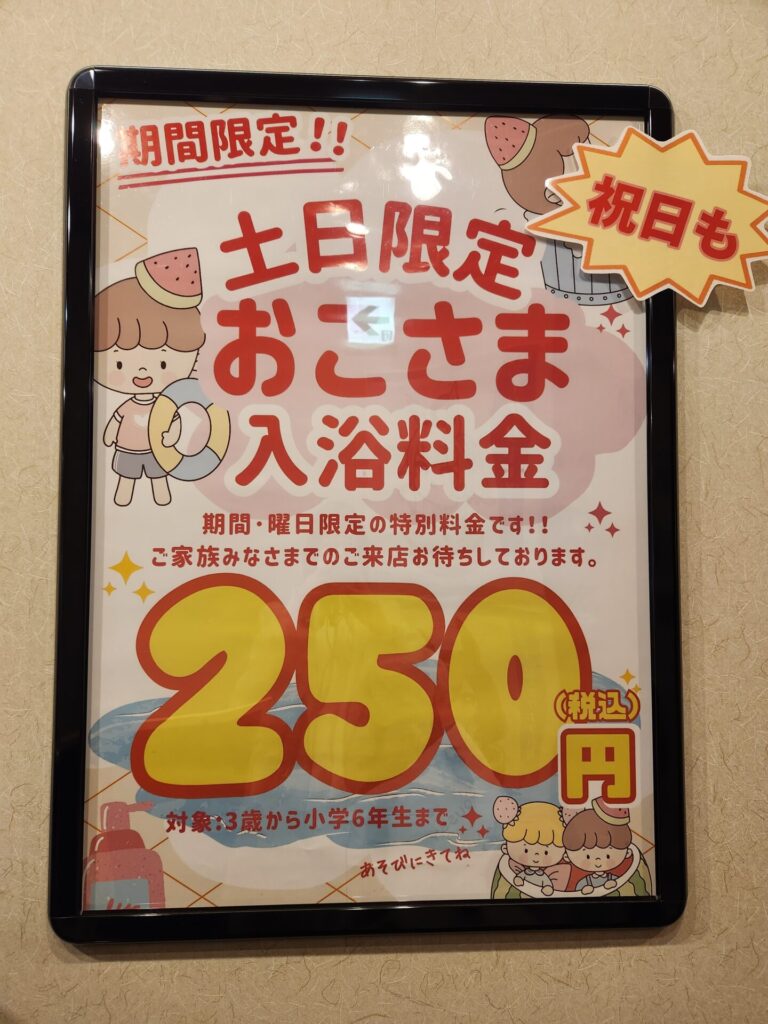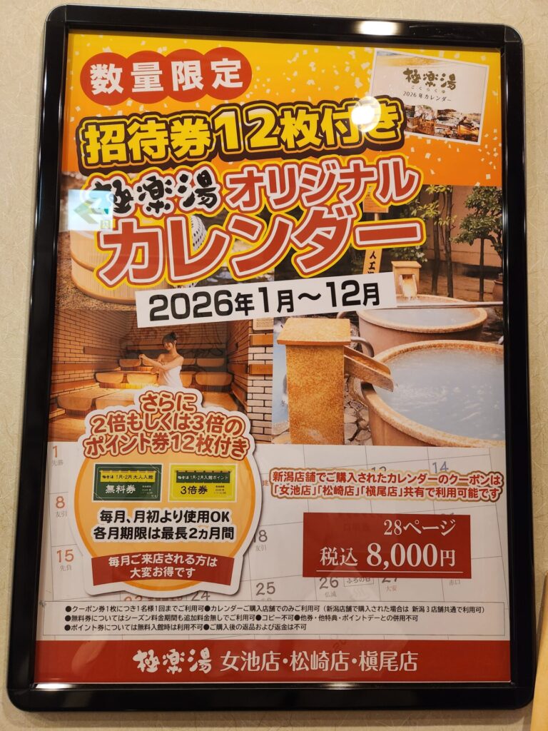 招待券12枚付きのオリジナルカレンダーの販売や、土日祝日限定おこさま入浴料金250円など、目白押し企画が盛りだくさんです。