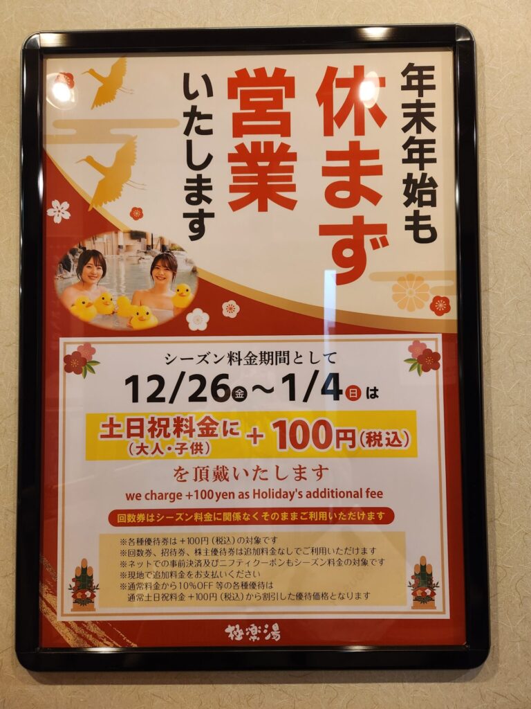 また、極楽湯様は年末年始も休まず営業してくださるそうです。ありがたい…