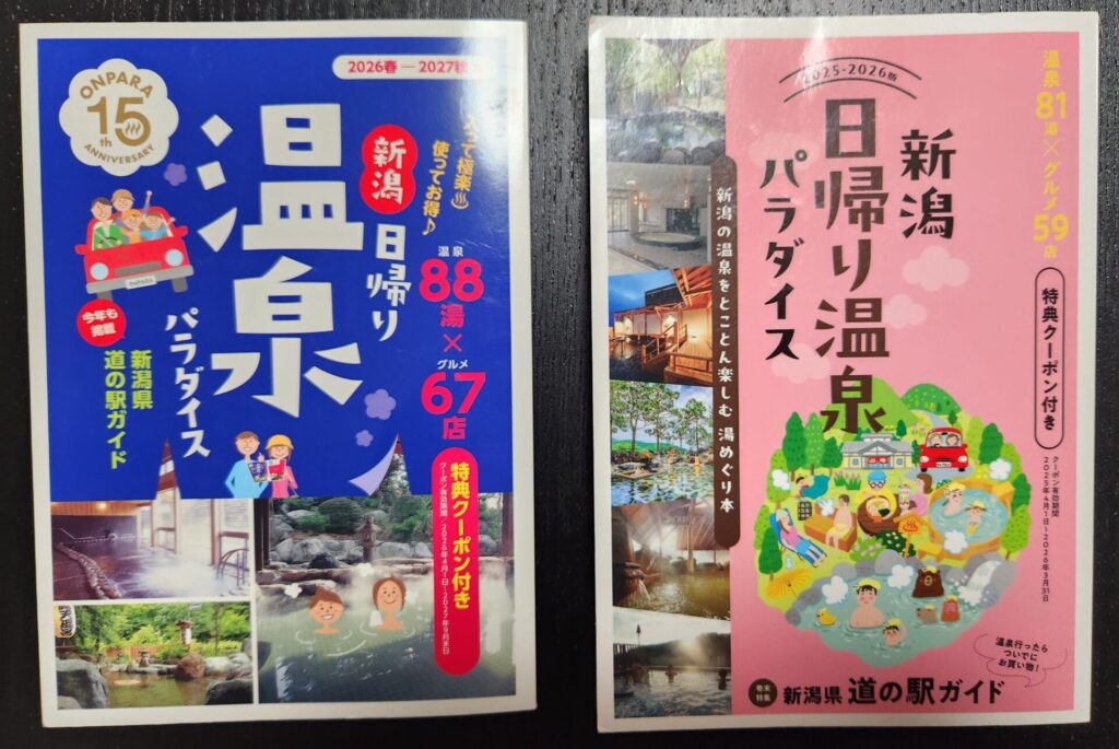 新潟日報メディアネット様から発行されている、「新潟日帰り温泉パラダイス」です。昨年夏頃にこの本の存在を知り、右側の2025-2026年版を購入しました。今年は2026春-2027秋版を4月1日発売当日に注文しました。新潟の日帰り温泉がたくさん載っていて、どの温泉がどんな泉質なのかを知ることができます。今年は昨年よりたくさん、新潟の温泉を巡りたいと思っております!